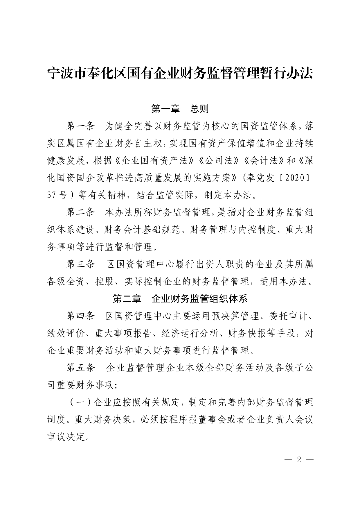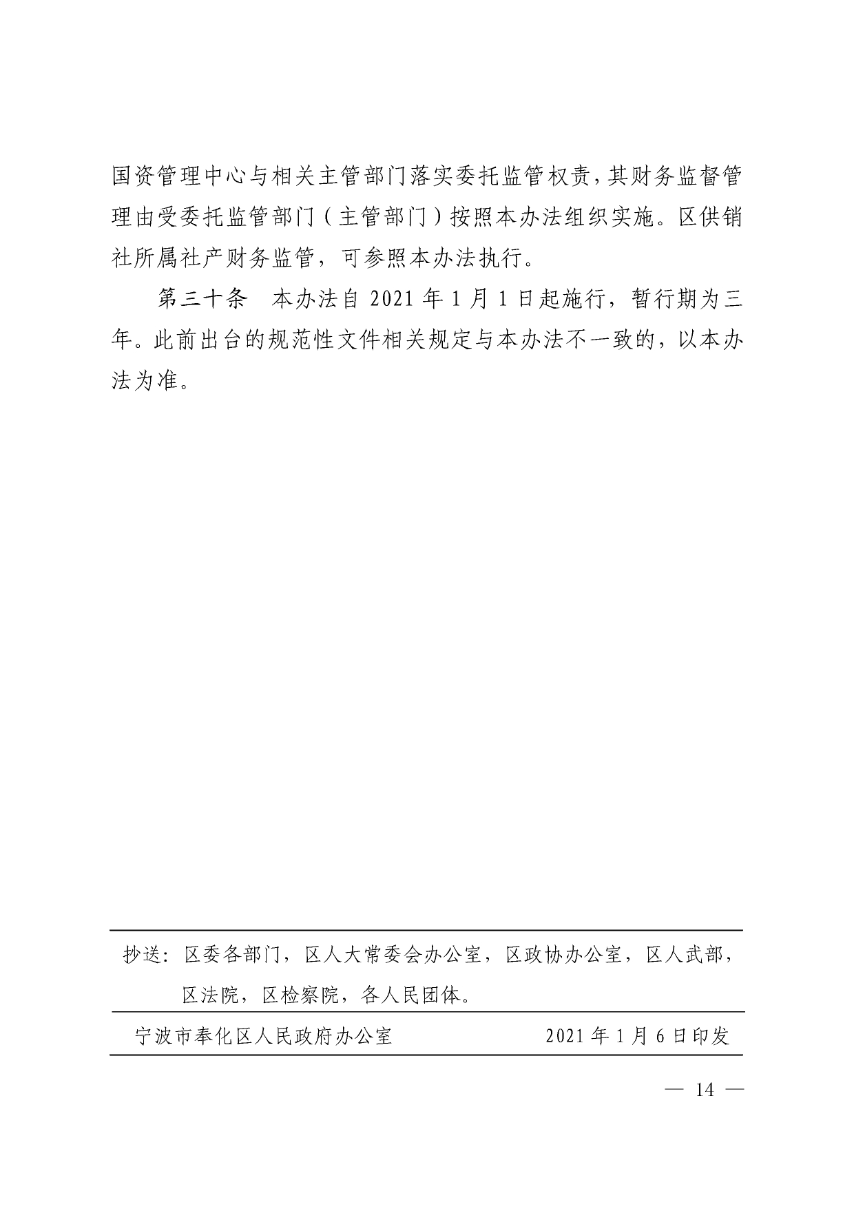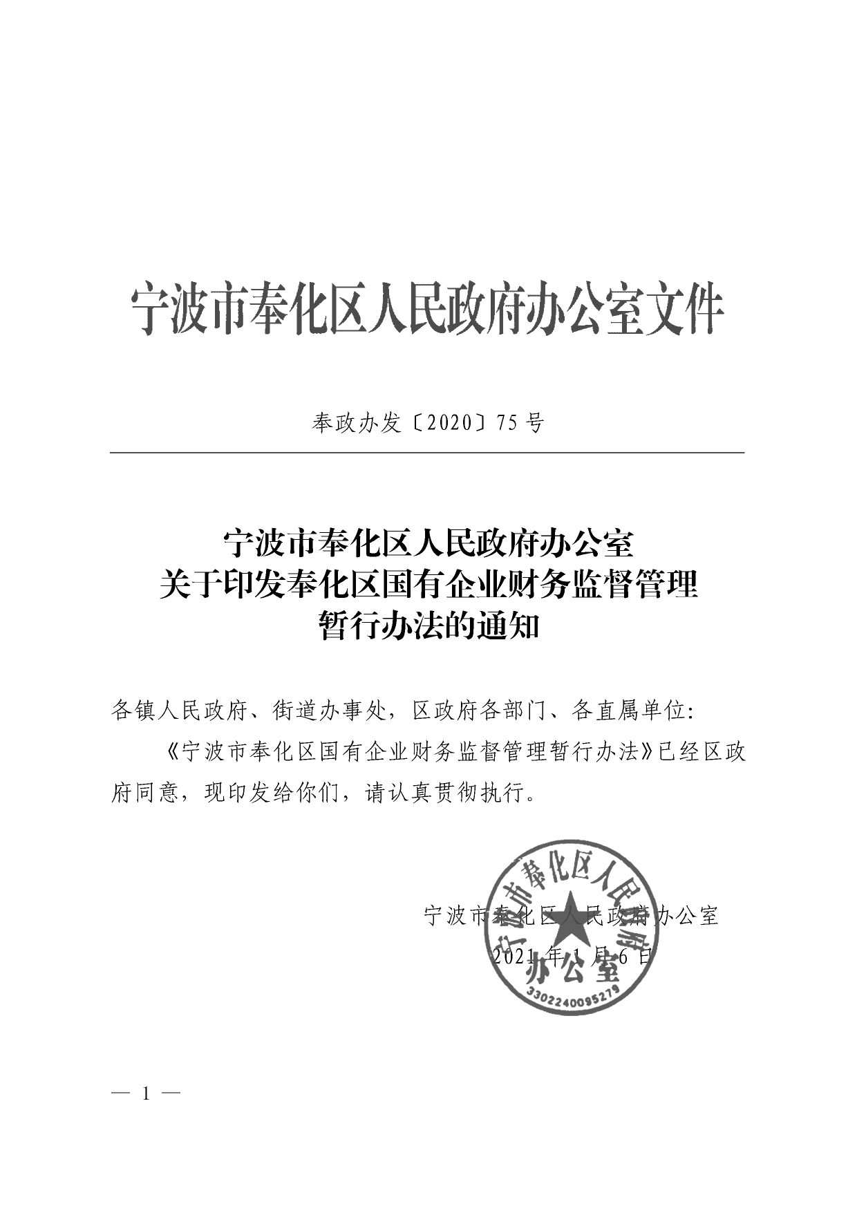 宁波市奉化区人民政府办公室关于印发宁波市奉化区国有企业财务监督管理暂行办法的通知奉政办发〔2020〕75号